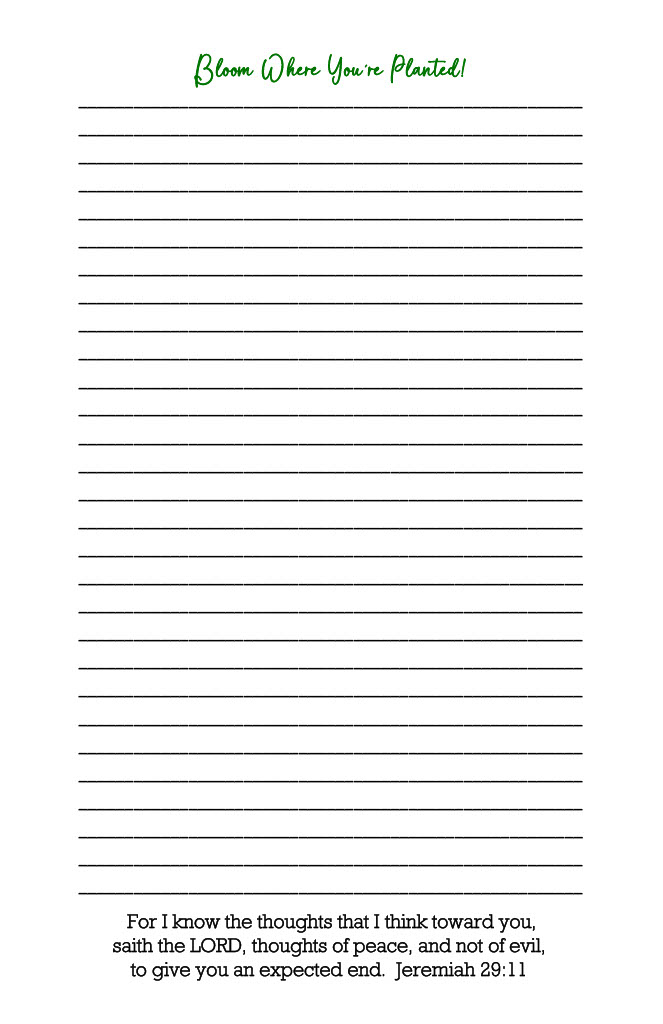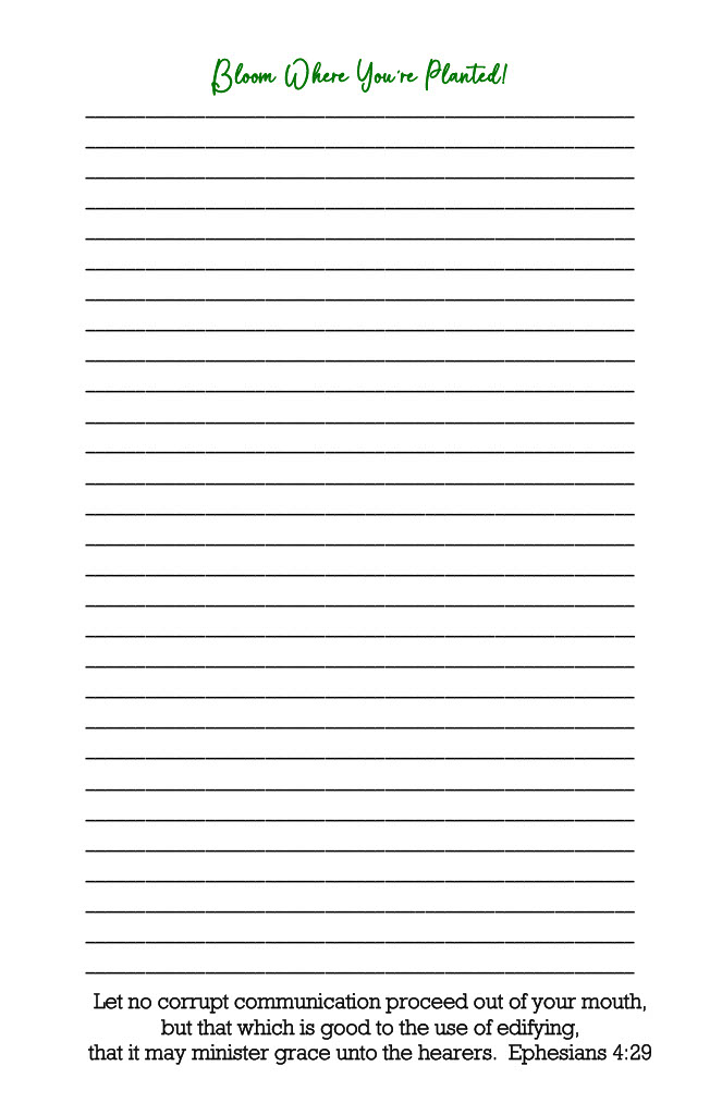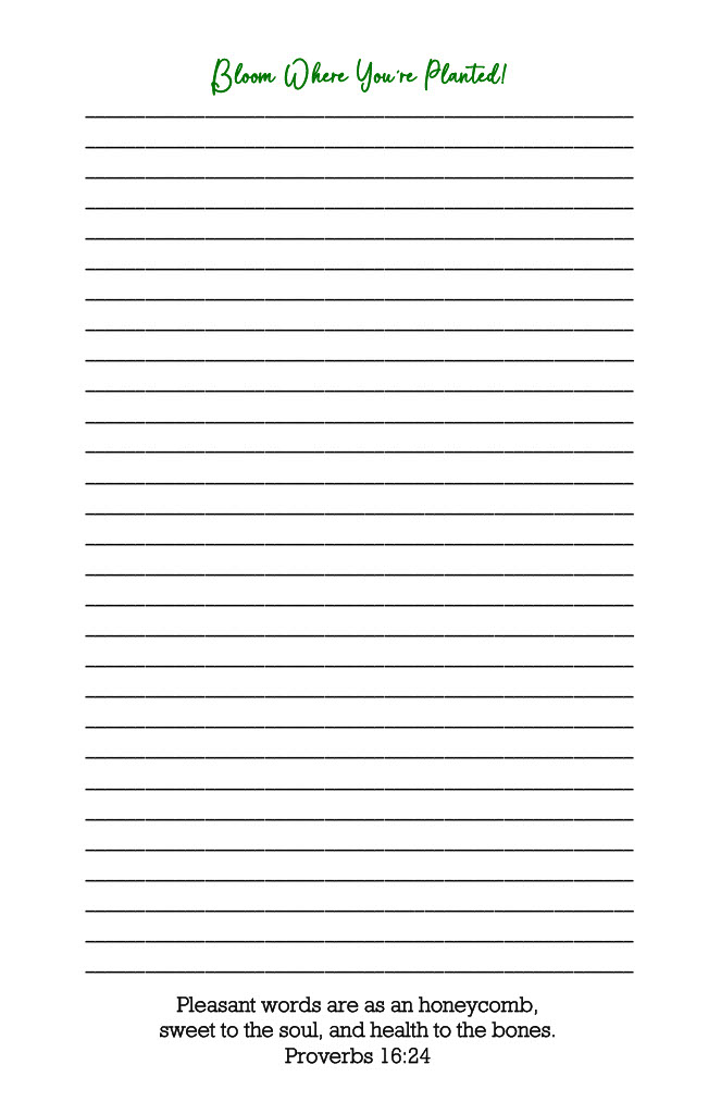 One hundred lined pages with Bible verses to lift your heart and to motivate you to encourage others. Bible verse (KJV) at the bottom of each page keeps your thoughts focused on Christ.